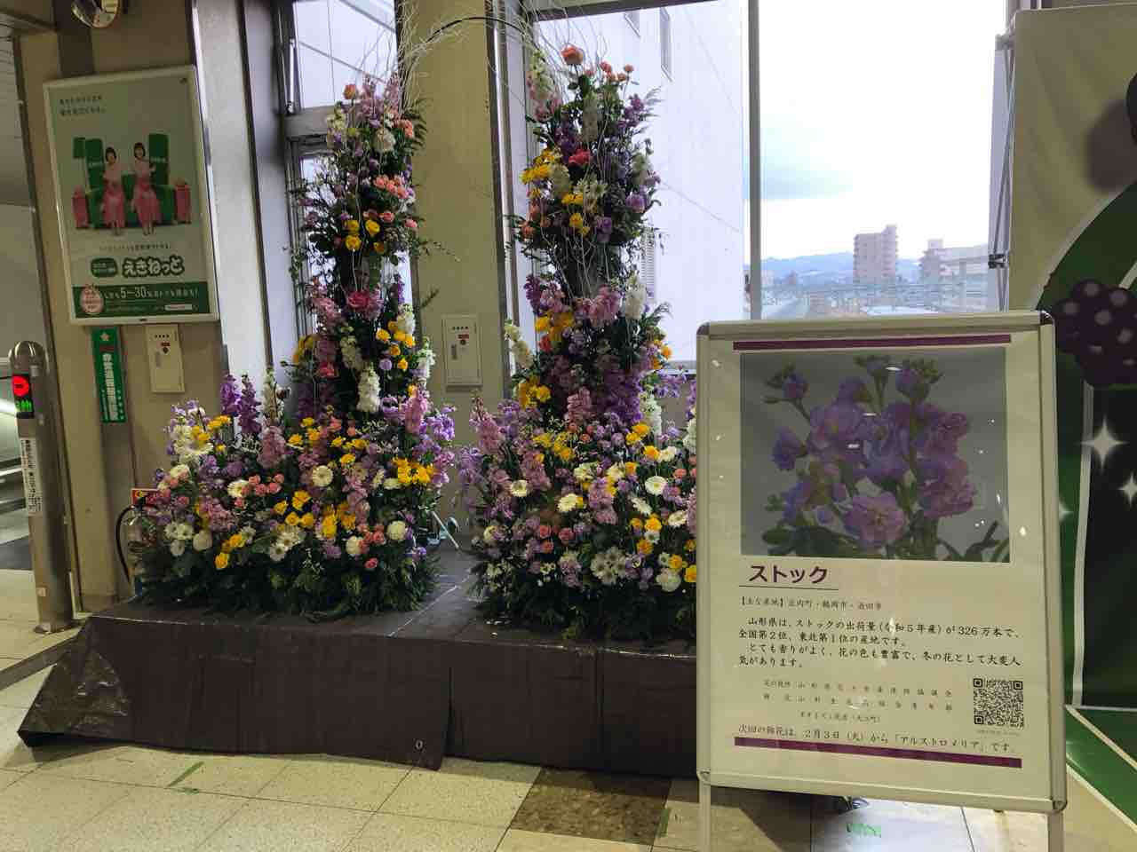 山形は生花のストックの産地として日本2位、東北地方トップだそうで、駅構内にきれいなディスプレイがありました。