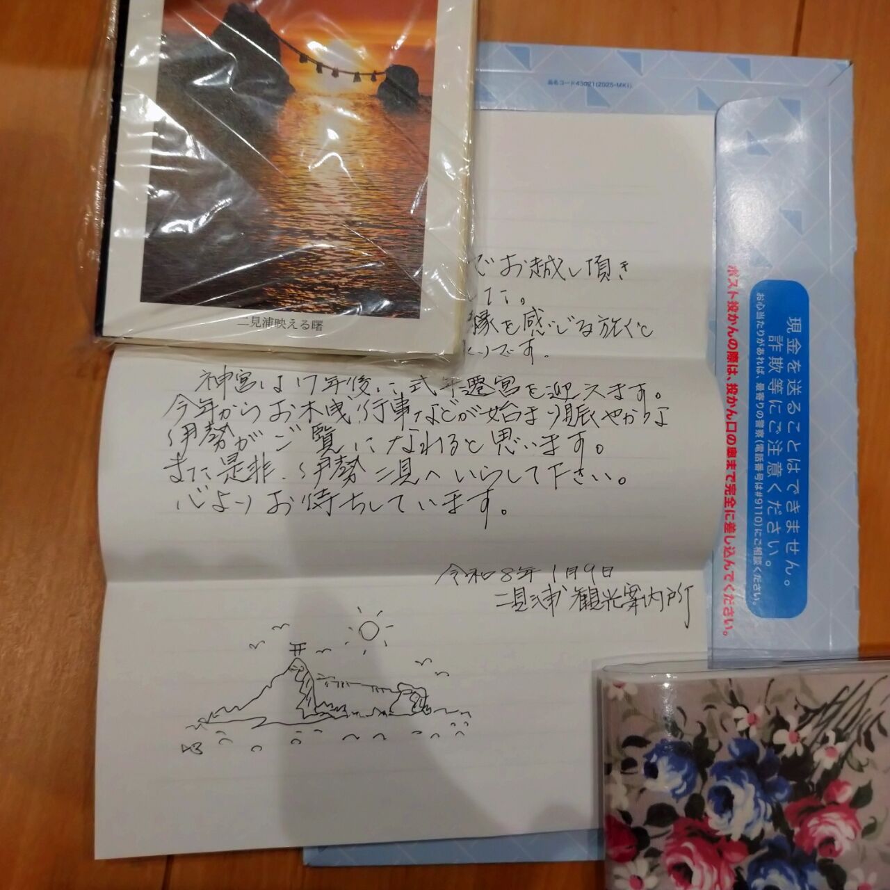 何とうれしい手描きのイラスト添えのお手紙、そして二見が浦の絵葉書まで入れてくださっていました。