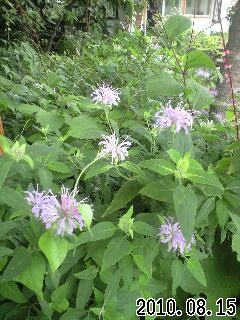終戦記念日ですが、八ヶ岳南麓の観光モードは今日も続いています。 三分一湧水の辺りも人が多いです。湧水の隣に蕎麦処や産直コーナーが有りますが、森ではなく、アスファルト舗装の日差しの強い場所なので、暑い、暑い! 午後、友人が観光ガイドで自宅近くにスポットされているので、畑をやってるとしょっちゅう尋ねられるカフェに一度行ってみたかったからと連れて行ってくれました。 さすが地元の人は見逃しがちな隘路も知っていてスムースに到着。 折々と言う名前の広いデッキのあるギャラリー併設、ふんだんに無垢の木を使ったステキなカフェでした。 帰り、地元スーパー(観光客、別荘族向け)に寄って貰ったら、こちらも賑わっていました。 土日祝日のETC割引の恩恵は殆ど受けられないと言う八ヶ岳南麓。確かに以前のお盆よりは空いている気がしますが、それでも、やはり書き入れ時には違いありません。 近所のお宅のモナルダがきれいに咲いていました。
