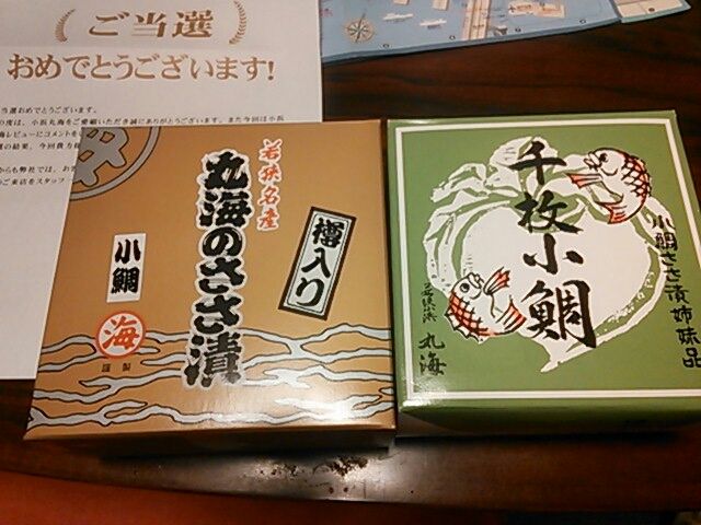 お歳暮に手渡し自宅取り寄せした小浜丸海、さんから、レビューコメントプレゼントに当選という事でいただきました。(^_^)v