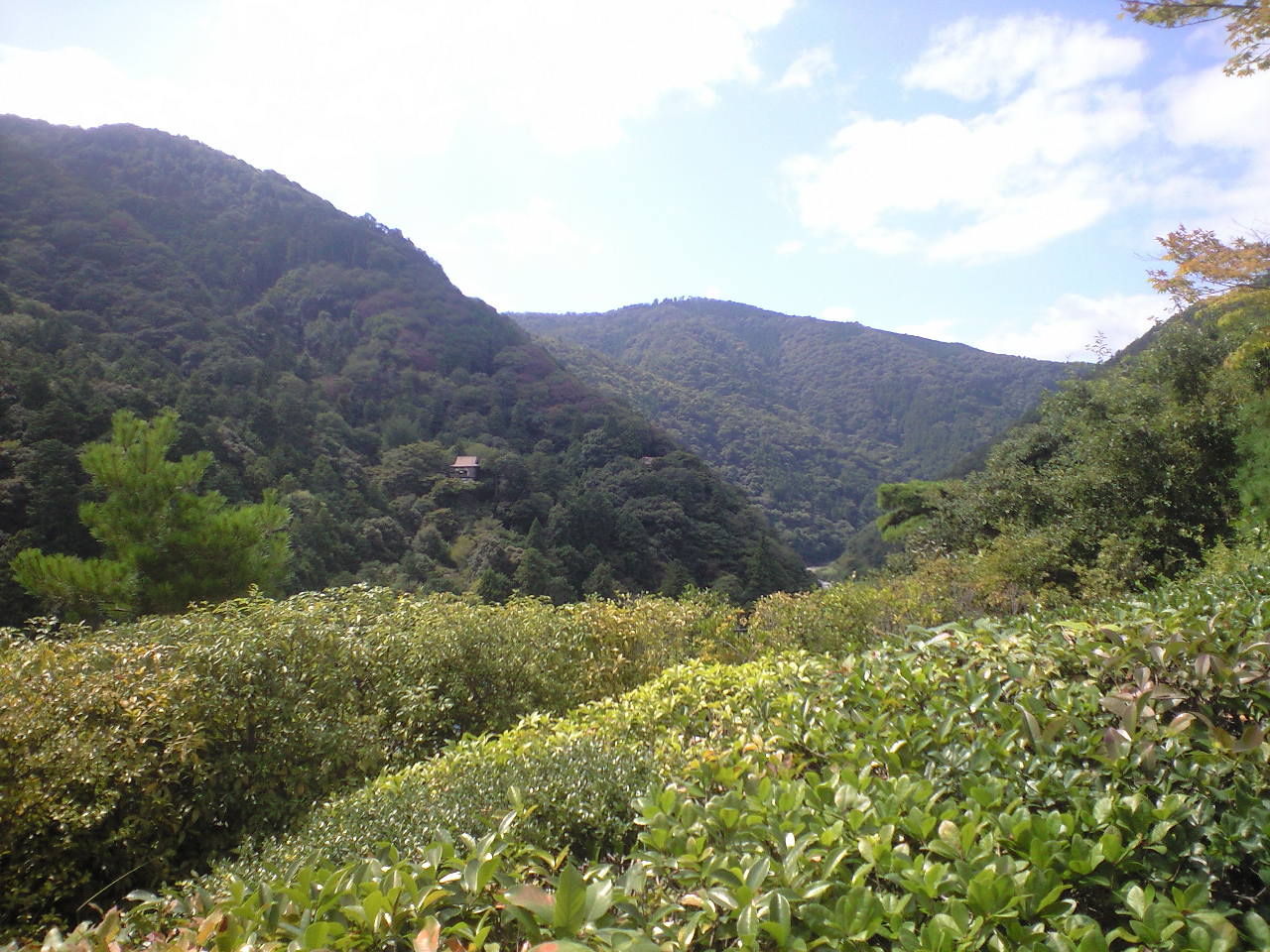 電線の一本もなく、まさに時代的の撮影にピッタリという風景。左手の小山の中腹にあるお堂。どうやってたどり着くのでしょうか? 修行のための建物に見えました。右によった山間には保津川が流れています。